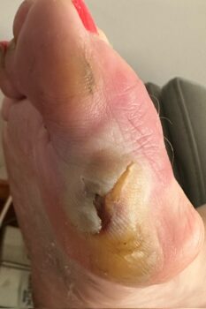The patient did a great deal of walking with improper shoes. The area becomes hot and painful when the skin broke down and infection occur.